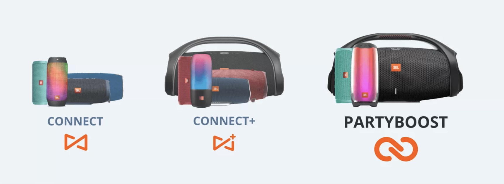 ๊ฐ์ฅ ์ค๋ฅธ์ชฝ์ด Flip5 ์ ํ์ ์ง์ํ๋ Partyboost ๋งํฌ์ด๋ฉฐ, Flip5๋ฅผ ํฌํจํ์ฌ Pulse4, Charge4, Boombox2๊ฐ 3์ธ๋์ ํด๋นํฉ๋๋ค. ์ญ์ 100๋ ์ด์์ ๊ธฐ๊ธฐ๋ฅผ ์ฐ๊ฒฐํ์ฌ ๋ฉํฐ ์คํผ์ปค๋ก ์ฌ์ฉํ ์ ์์ต๋๋ค.