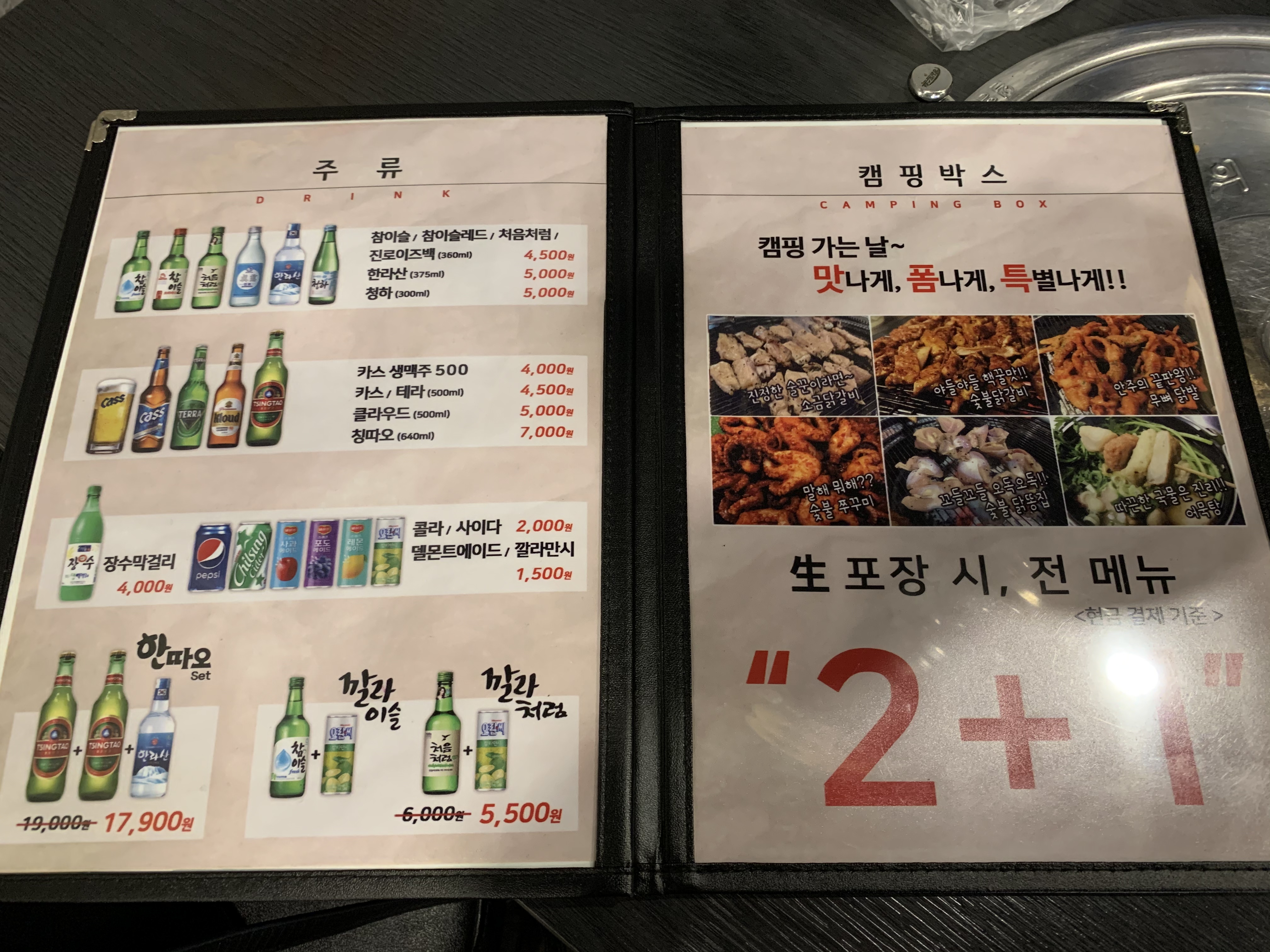 ์ฃผ๋ฅ๋ ์์ฃผ, ์ฒญํ, ๋งฅ์ฃผ, ๋ง๊ฑธ๋ฆฌ๊ฐ ์๊ณ ๋ค์ํ ์ข ๋ฅ์ ์๋ฃ์๋ ํ๋งคํด์. ๋ธ๋ชฌํธ ์์ด๋? ์๋ฌป๋ฐ ์์ฃผ๋ฅผ ์ฃผ๋ฌธํ๊ธฐ ๋๋ฌธ์ ์๋ฃ ๋ฉ๋ด๋ ์์ธํ ๋ณธ์ ์ด ์๋๋ฐ ๊ฐํฉ ๊ณต๊ธฐ๋ฐฅ๋ถํฐ ํน์ดํ ๋ฉ๋ด๊ฐ ๋ง์ ๊ณณ์ด๋ค์. ๊ฟ๊ผฌ๋ญ์ ์ข์ ์ ์ ํฌ์ฅ์ ํ๋ฉด ์ ๋ฉ๋ด 2+1์ด ์ ์ฉ๋๋ค๋ ์ ์ด์์. ํ์ ์ ์ก๊ณ ๋๋ฌ๊ฐ๊ฑฐ๋ ์บ ํ์ ๊ฐ ๋ ๋ฐ๋ฒ ํ๋ก ํด๋จน์ผ๋ฉด ์ข์ ๊ฒ ๊ฐ์์.