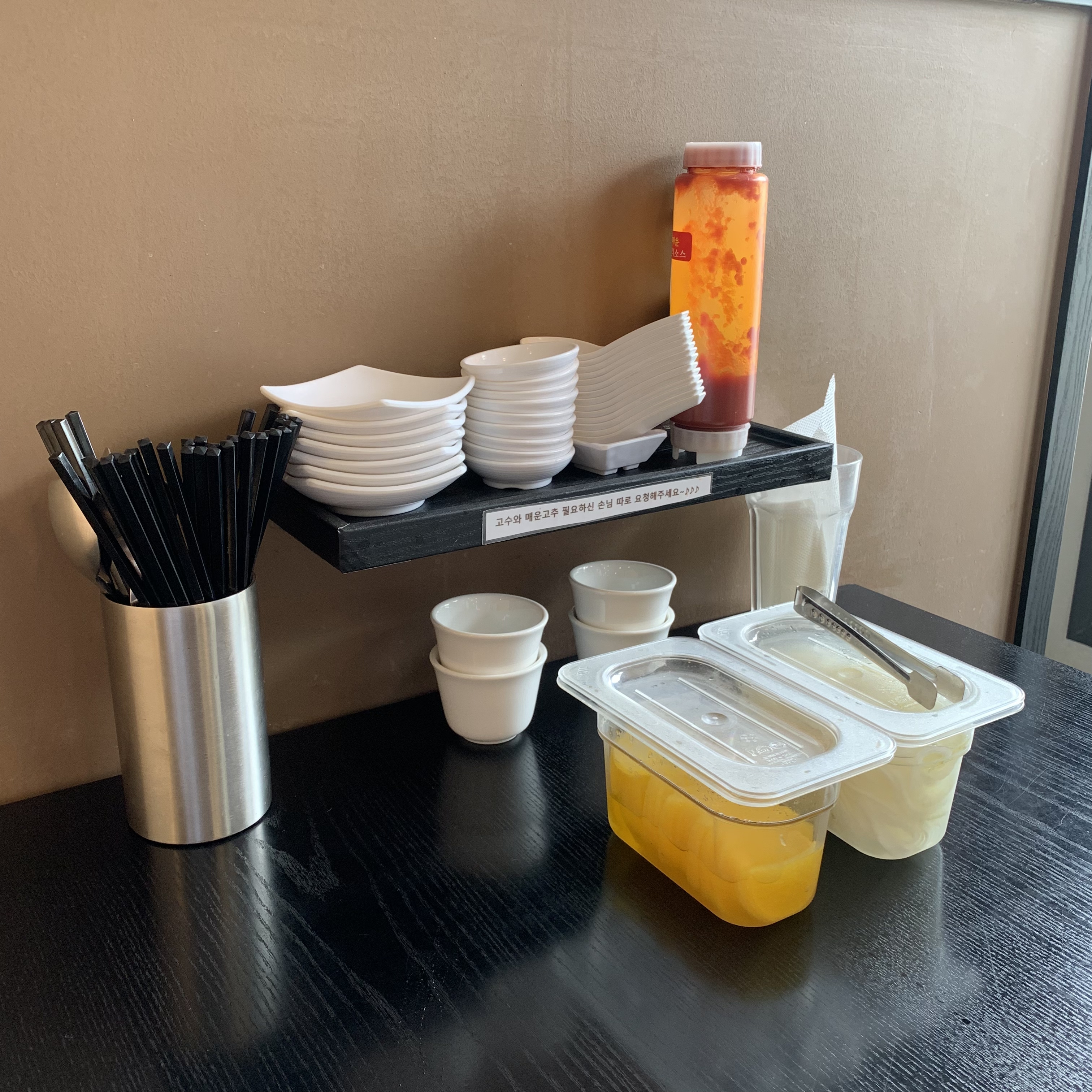 ํ ์ด๋ธ์ด ๊ต์ฅํ ๋์ ์ ์ด ์ข์์ด์. ์์ ์ ์์ค ์ข ์ง, ์์ ๊ทธ๋ฆ, ๋ ํจ, ๋ฌผ์ปต, ๋จ๋ฌด์ง, ์ ์ธ ์ํ๊ฐ ์ค๋น๋์ด ์์ต๋๋ค. ๊ฐ์ด ๊ฐ ์น๊ตฌ๊ฐ ๋จ๋ฌด์ง์ ์ ์ธ ์ํ๋ฅผ ์ข์ํ๋๋ฐ ๋ฐ๋ก ์์ฒญํ์ง ์์๋ ์ํ๋ ๋งํผ ๋จน์ ์ ์๊ฒ๋ ์ค๋น๋์ด ์๋ ์ ์ด ์ข์์ด์. ๊ณ ์์ ๋งค์ด๊ณ ์ถ๊ฐ ํ์ํ ์๋์ ๋ฐ๋ก ์์ฒญํ๋ฉด ๋๋ค๊ณ ํฉ๋๋ค. ์ ํฌ๋ ๊ณ ์๋ฅผ ์์ฒญํด์ ์๊ตญ์์ ๋ฃ์ด ๋จน์์ด์.