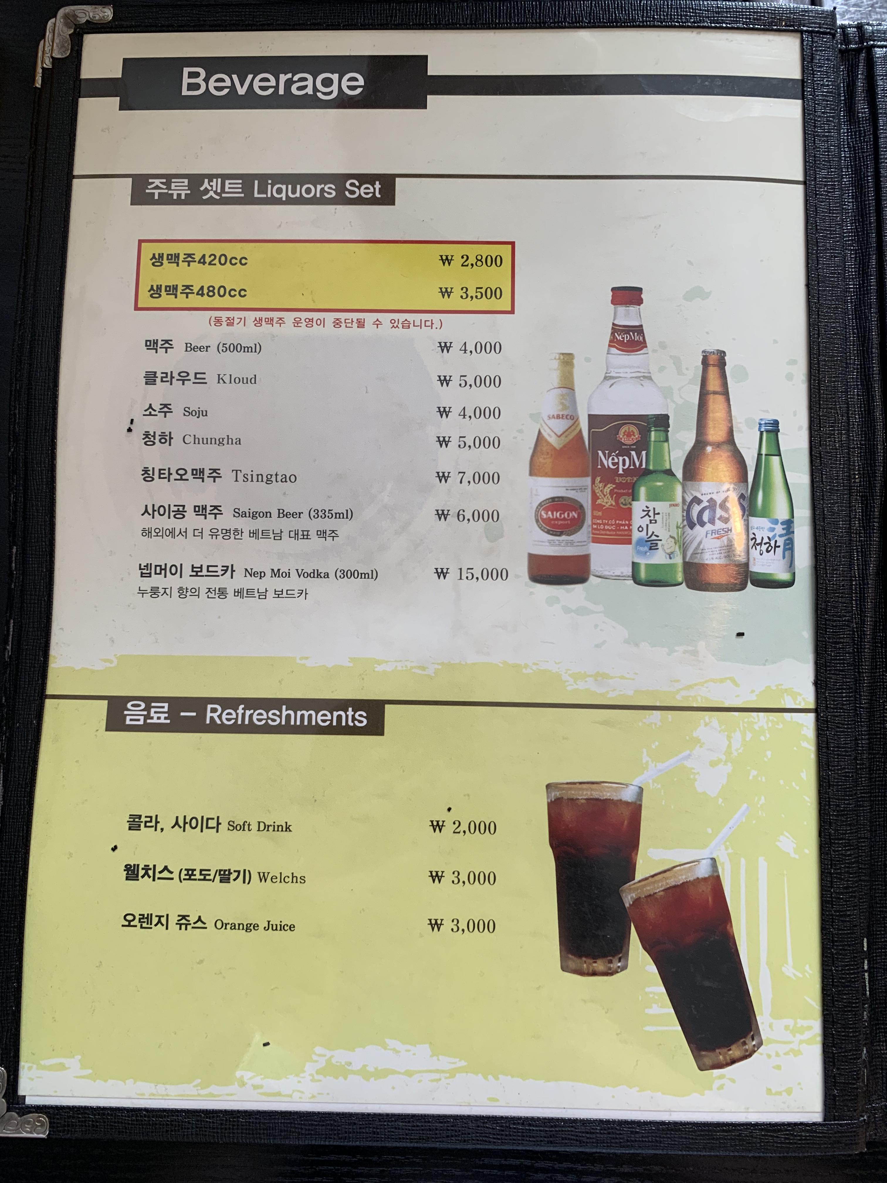 ์คํ์ ๋ฉ๋ด๋ก ์๋จ์๊ณผ ๋ถ์ง, ์ค๋ธ์ค๋ธ๊ฐ ์๋ค์. ์ฃผ๋ฅ๋ ์๋งฅ์ฃผ์ ์์ฃผ, ์ฒญํ, ๋ณด๋์นด๊ฐ ์๊ณ ์๋ฃ ๋ฉ๋ด๋ก๋ ํ์ฐ์๋ฃ์ ์ค๋ ์ง ์ฃผ์ค๊ฐ ์์ต๋๋ค.